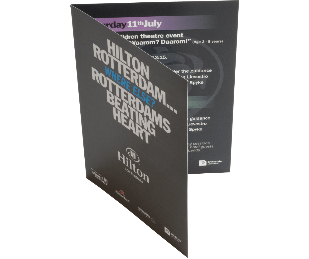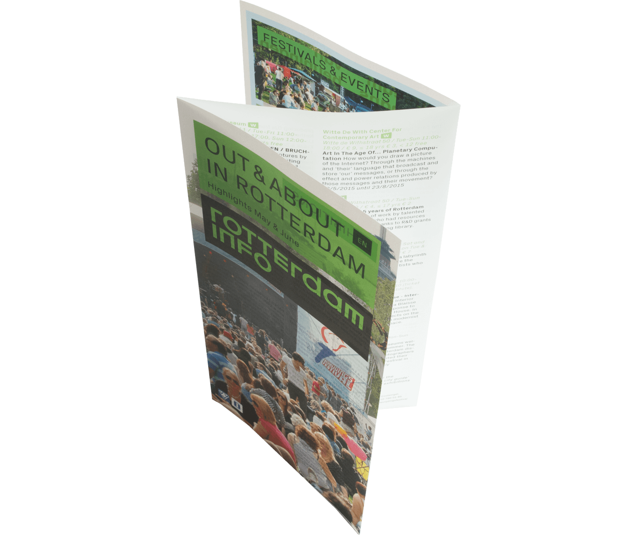 Laat uw folders drukken in kleine oplage vanaf 25 stuks of in grote oplage vanaf 100 stuks. Promotionele en luxe zakelijke folders met een ruime keuze uit formaten, papiersoorten en levertijden. De folders worden standaard dubbelzijdig in full colour gedrukt. Keuze uit diverse vouwwijzen zoals enkel, wikkel, zigzag, kruisslag of (gesloten) luikvouw. Folders met een enkele vouw bestaan uit 4 pagina's. De wikkelvouw, zigzagvouw en de luikvouw bestaan uit 6 pagina's. De wikkelvouw en zigzagvouw zijn ook in 8 pagina's te bestellen. De kruisslag en de gesloten luikvouw bestaan uit 8 pagina's. Voor een extra luxe uitstraling en stevigheid kunnen de folders gelamineerd worden met glans laminaat, mat laminaat of krasvast laminaat.