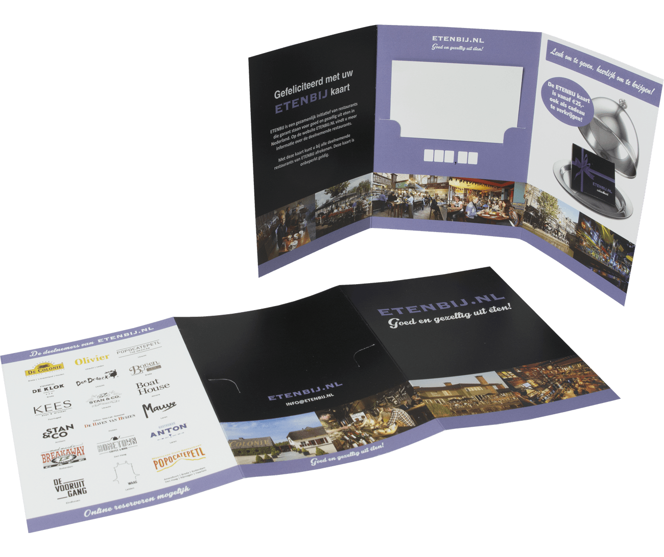 Stevige papieren kaarthouders bedrukken in uw eigen ontwerp. In de kaarthouder kan een pasje met een formaat van 85 x 55 mm ingestoken worden om vervolgens te overhandigen aan uw klant. Prima te gebruiken voor dinerpasjes, kamerpasjes, klantenkaarten en waardebonnen. Zowel de buiten- als de binnenzijde worden in full colour bedrukt. De bedrukte kaarthouders zijn leverbaar in 7 verschillende modellen. Kies voor offset papier als er op de kaarthouder geschreven moet worden. De kaarthouders worden plano, uitgevouwen geleverd.
