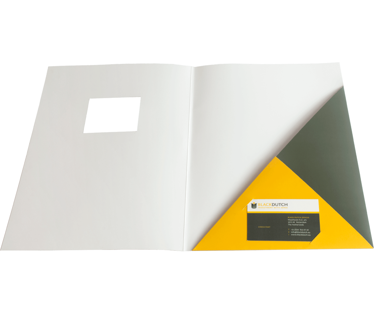 Slits voor visitekaartjesEen aantal van onze A4 mappen bedrukken en stansen wij standaard met visitekaart slits. Slits zijn inkepingen in de flap van de map waar een visitekaartje in kan worden gestoken van 85 x 55 mm. Deze slits zitten niet standaard in alle presentatiemappen. Mocht u dit toch graag in uw map willen of heeft u vragen over deze of andere afwerkingen, dan kunt u altijd contact met ons opnemen. Staat uw gewenste afwerking er niet bij? Bel ons gerust op via 010 - 7 410 420 of vraag een offerte aan. Binnen 8 uur ontvangt u de offerte van ons. |